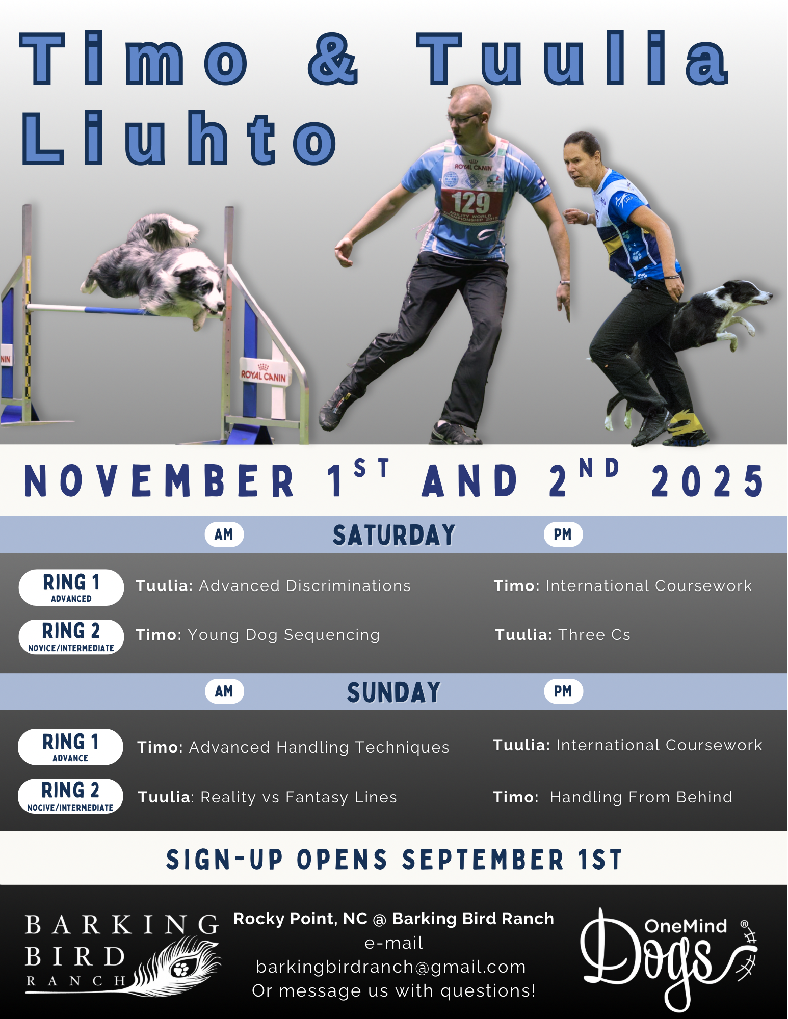 Finnish One Mind Dog Instructors Timo and Tuulia will be joining us in November! Perfect chance for to prep for the open on dirt footing. Two rings, 8 seminars!